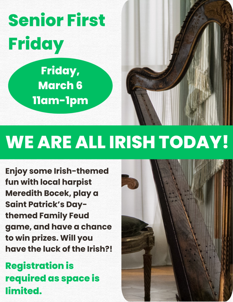 Senior First Friday Program – Harpist, Family Feud, Prizes, and Lunch: Friday, March 6 | 11am-1pm